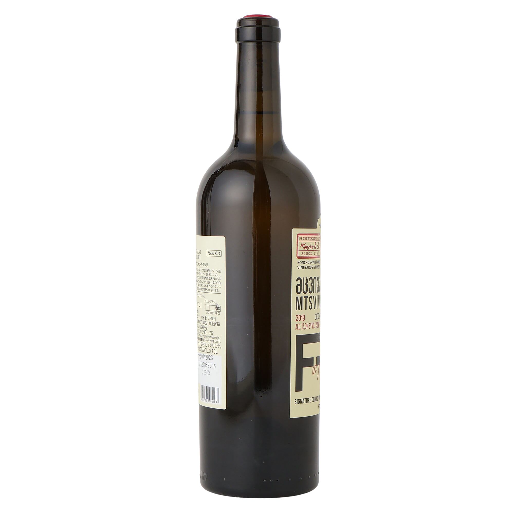 ワイン発祥の地と言われるジョージアのかヘチ地方で16世紀からワイン造りを続けている”JSCキンズマラウリ”社。そのオーナー名を冠したプレミアムな”コンチョ”シリーズです。キンズマラウリ社の限定畑で栽培された非常に古く珍しいジョージアの固有品種「ムツヴィヴァニ」から造られるこの白ワインは、熟したピーチやくるみの香り、複雑でミネラル感溢れるバランス良い味わい、長い余韻が特徴です。鶏肉など白身の肉料理とよく合います。
